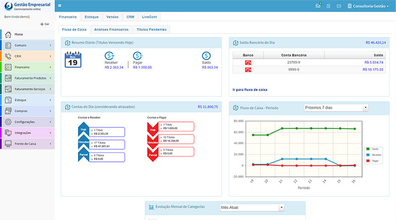 Painel de Gerenciamento FinanceiroCom o painel de gerenciamento você visualiza gráficos do fluxo de caixa, categorias de despesas e receitas, resumo diário de recebimentos e pagamento, saldos de contas bancárias, além de demonstrar os clientes que estão com débitos pendentes com a sua empresa. |